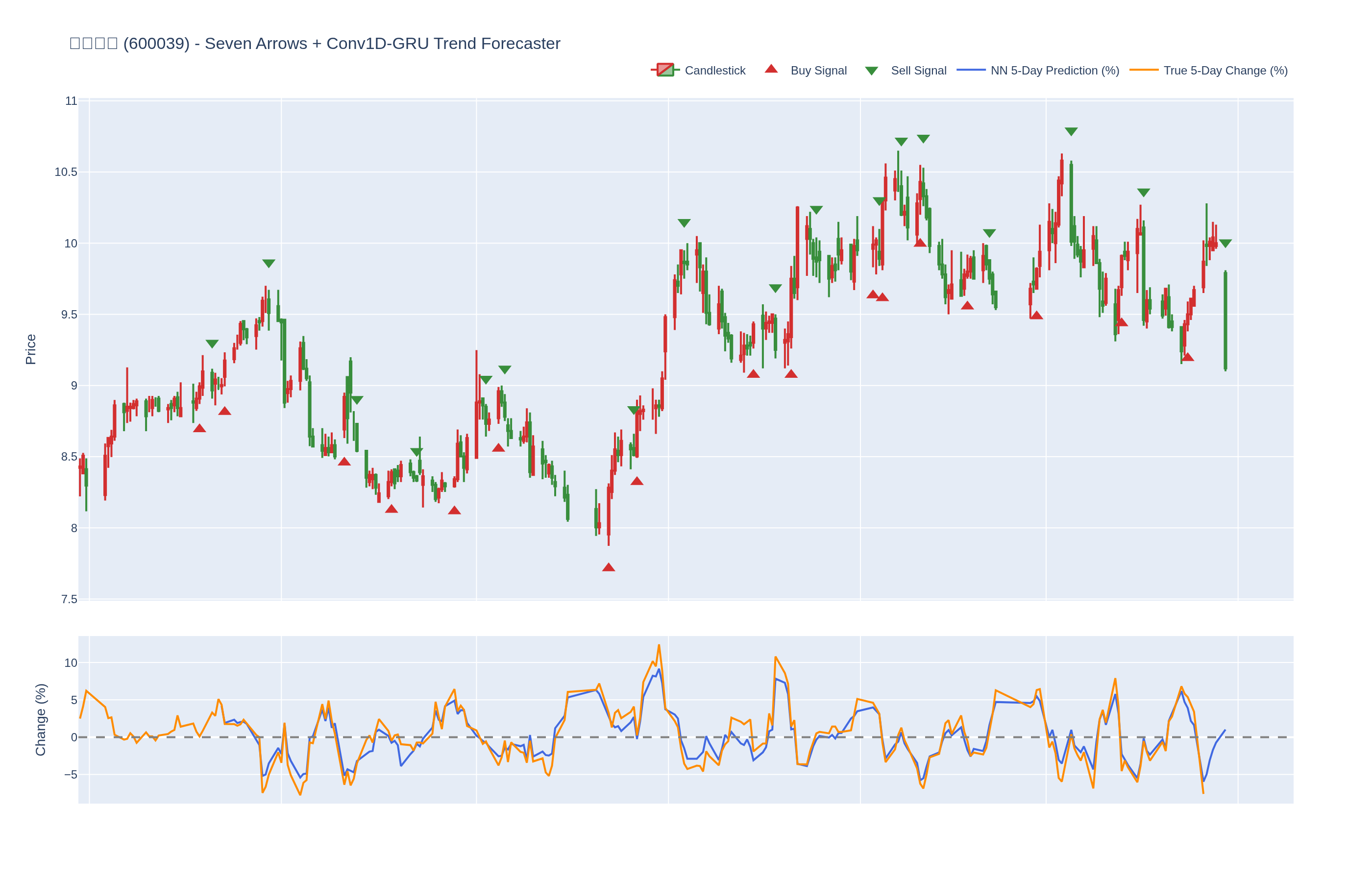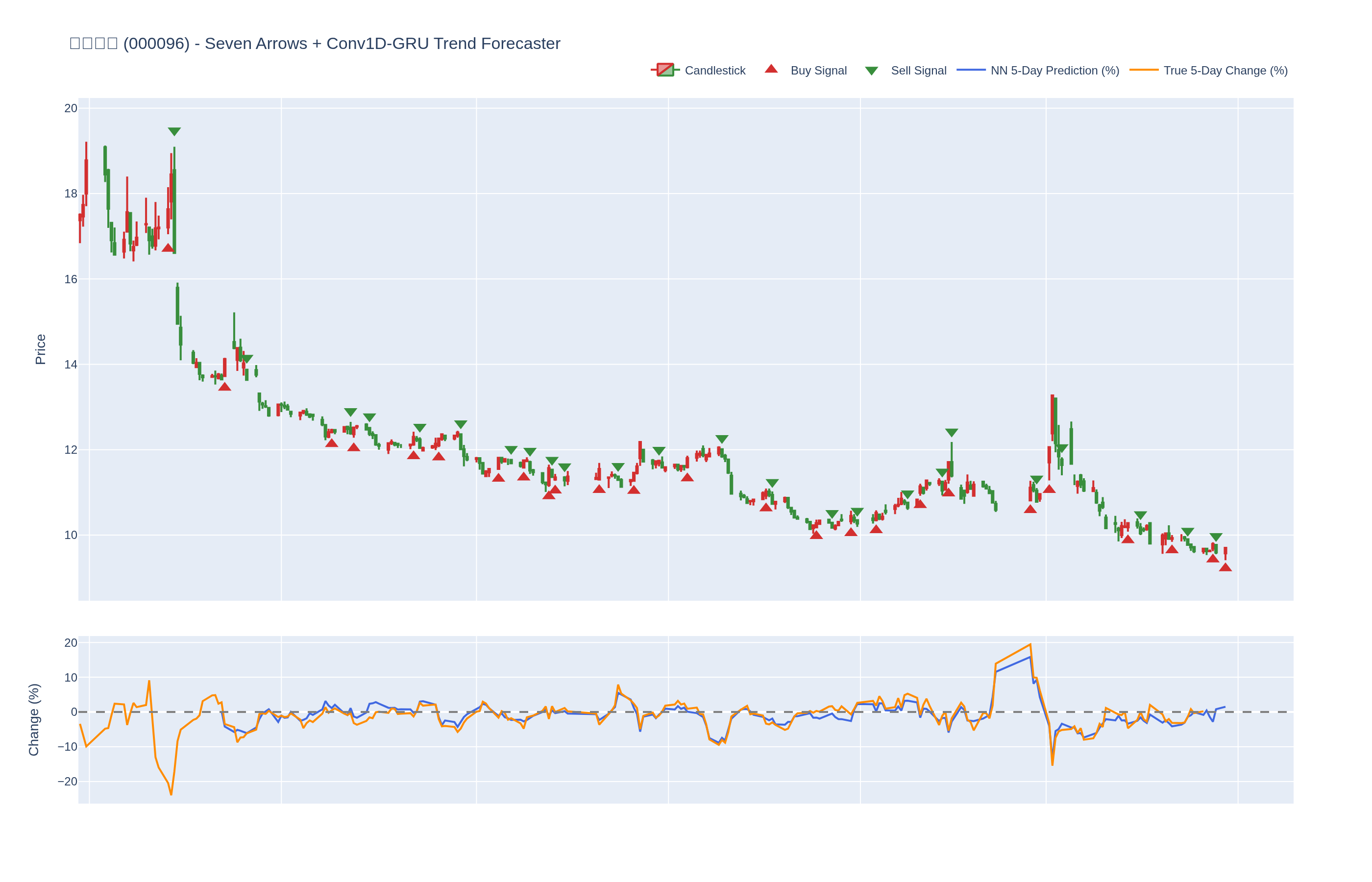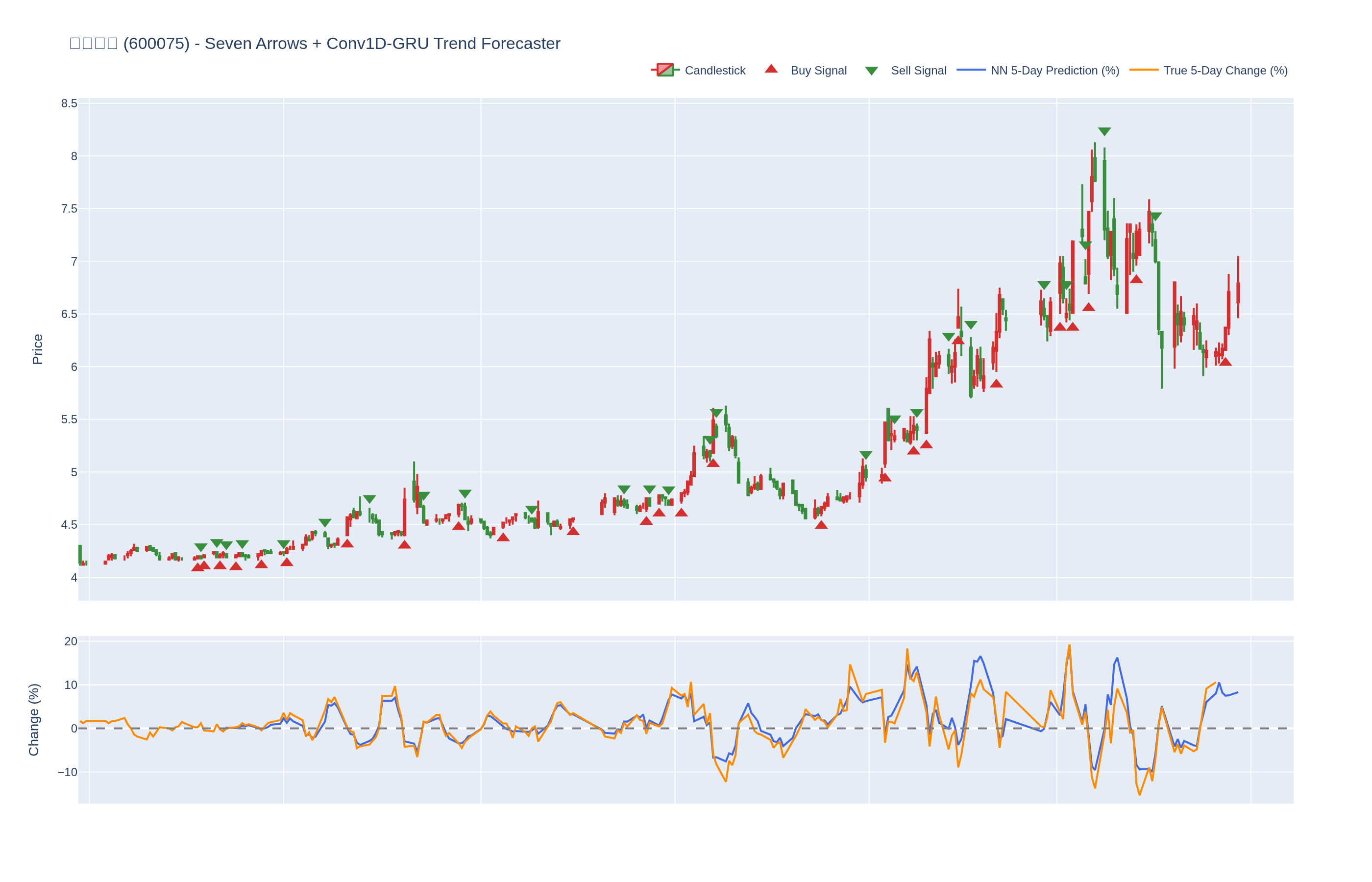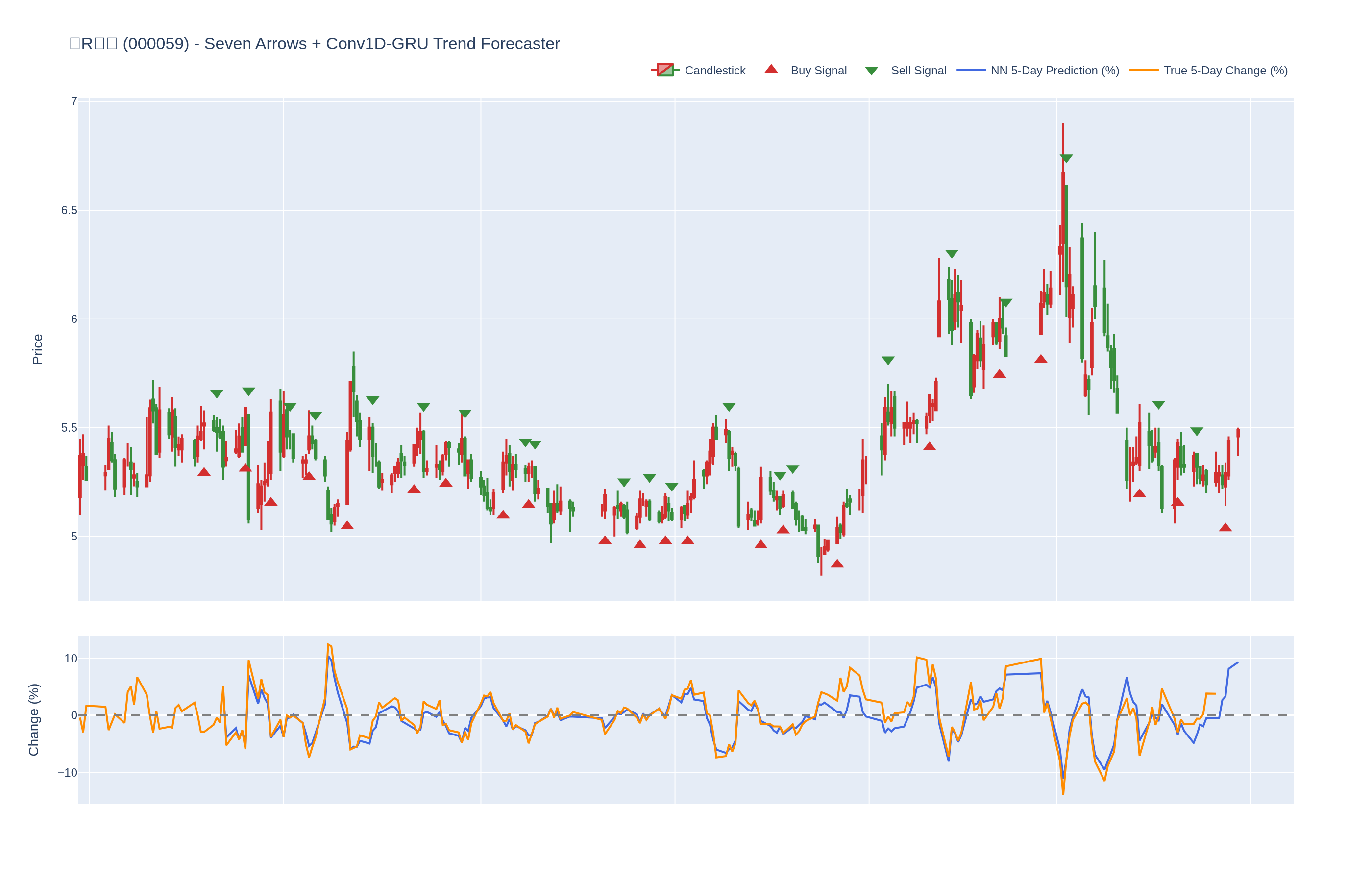 本系统结合七个技术指标与每只股票的 Conv1D-GRU 模型,神经网络预测未来 5 日内的价格百分比变化。