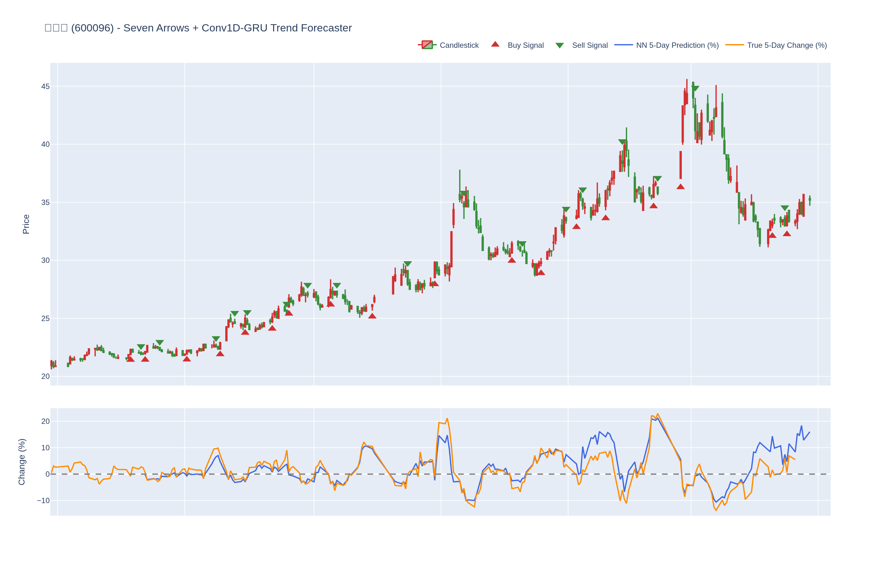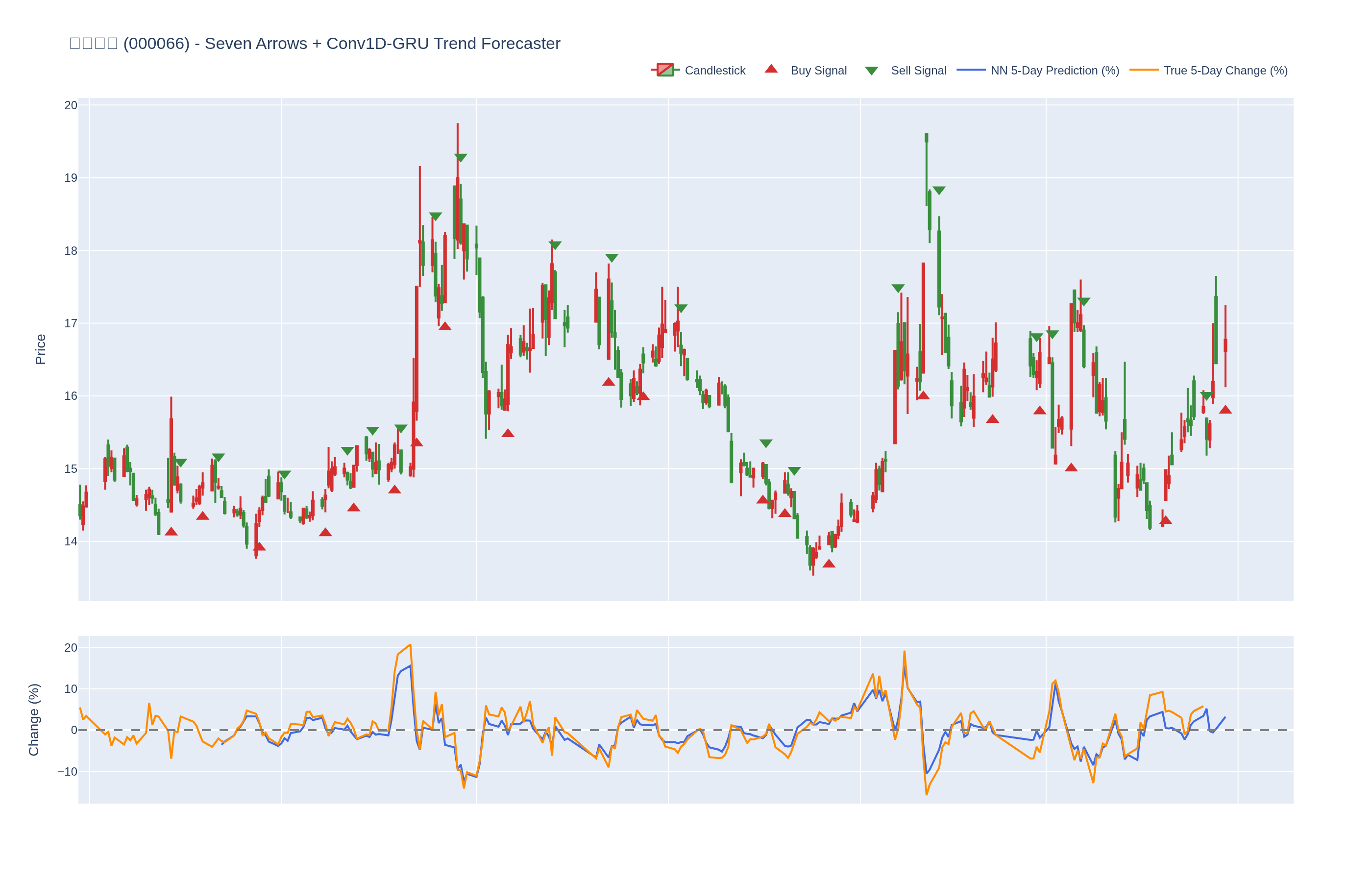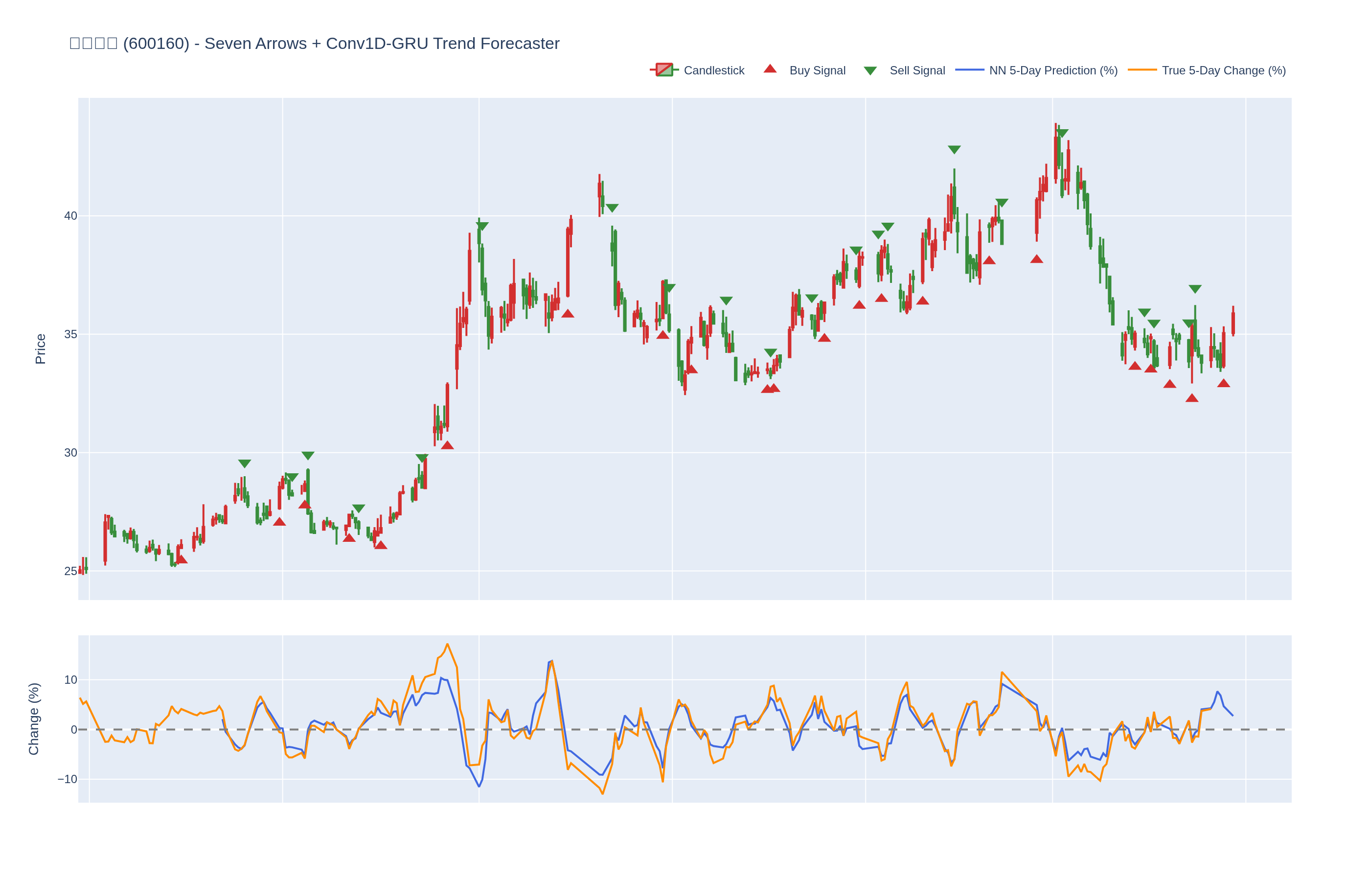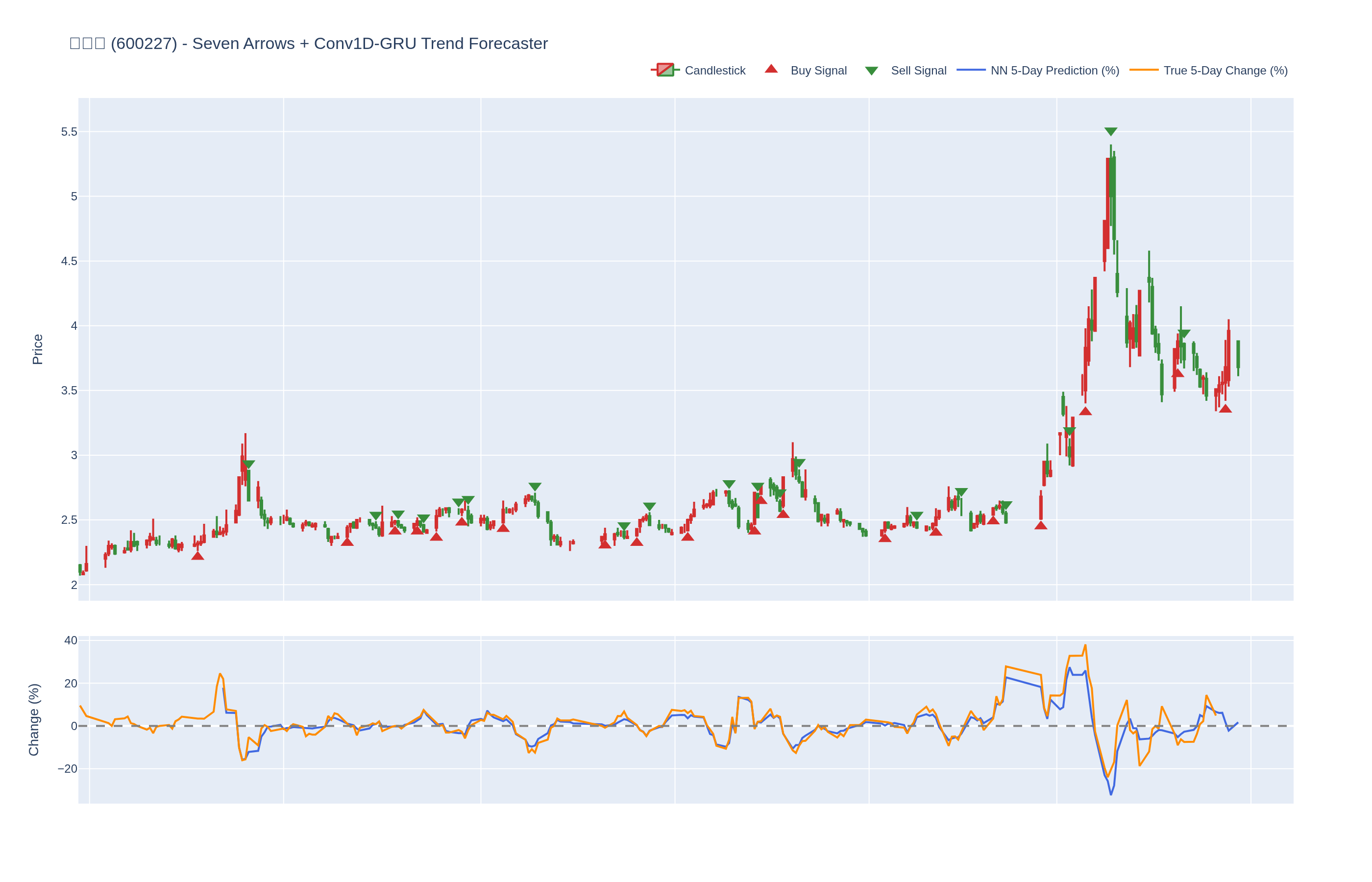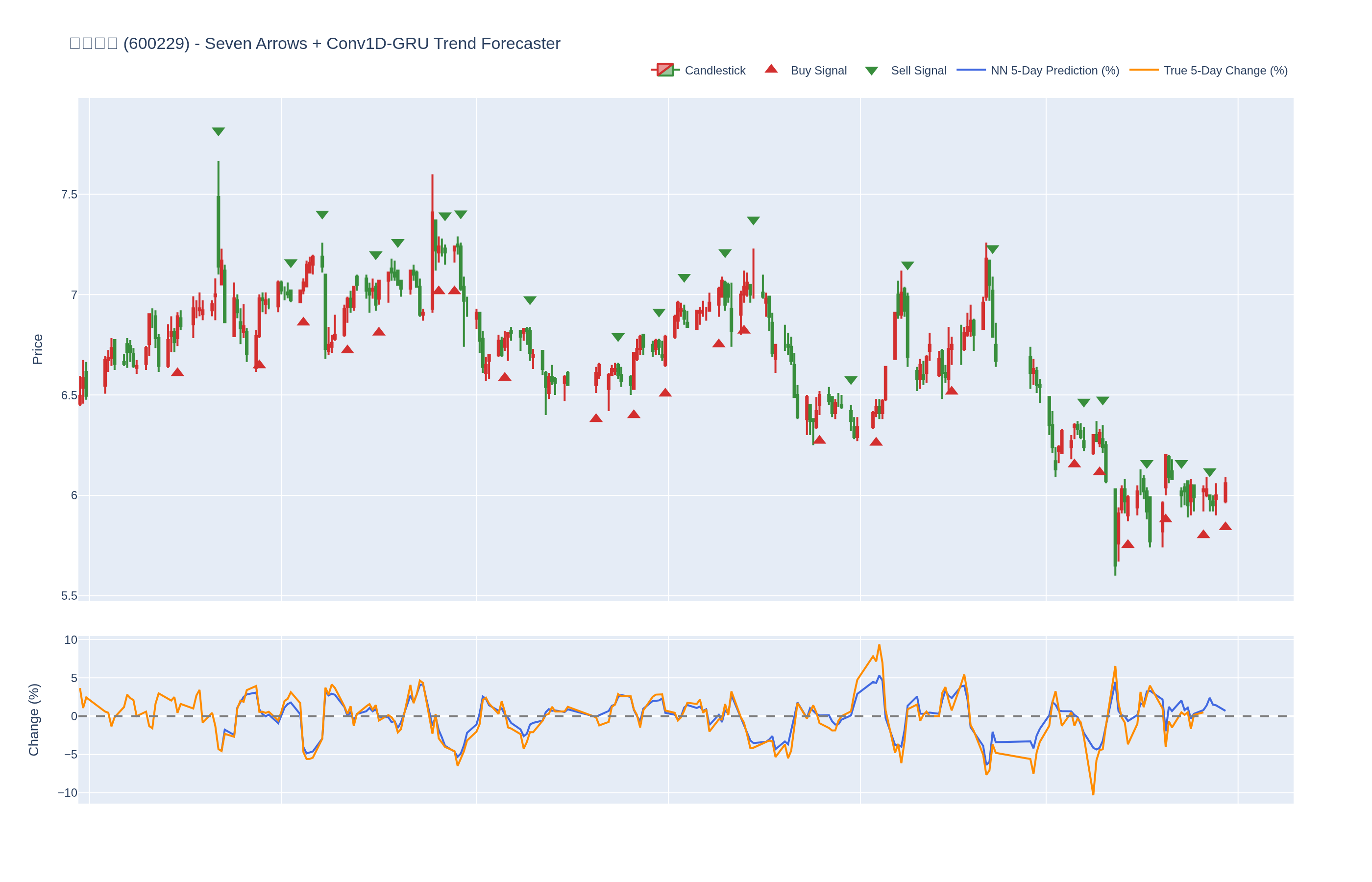 本系统结合七个技术指标与每只股票的 Conv1D-GRU 模型,神经网络预测未来 5 日内的价格百分比变化。