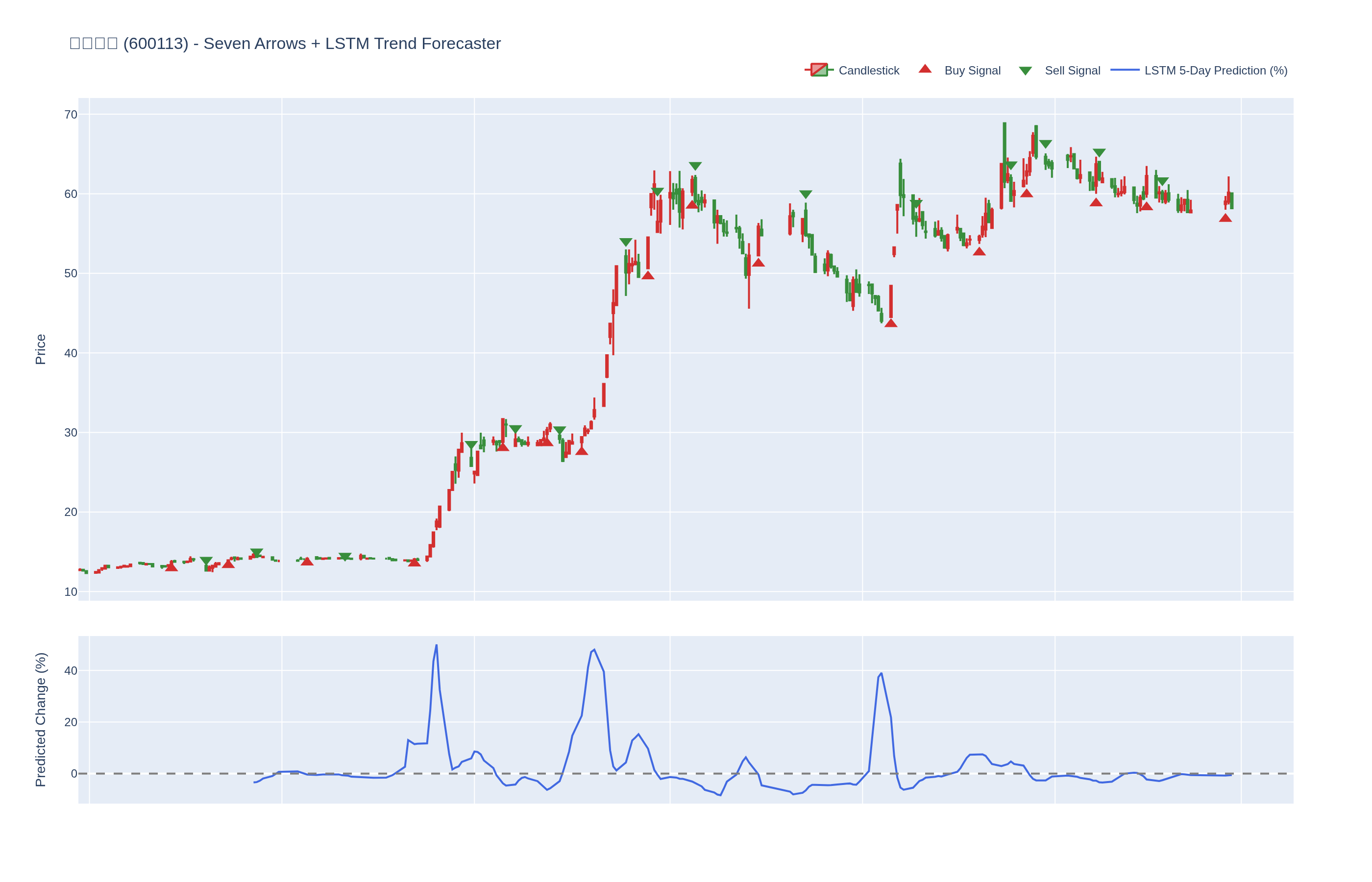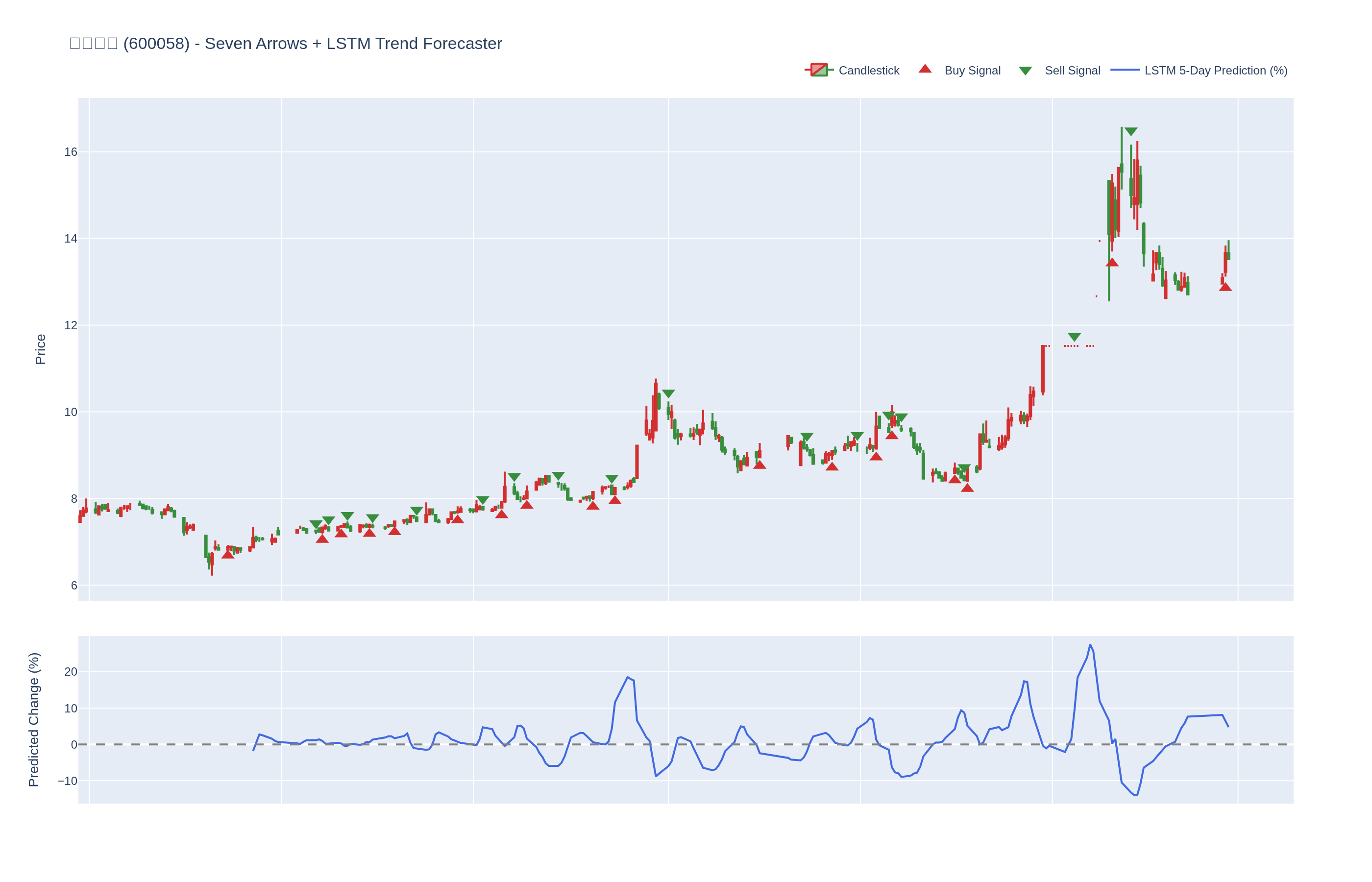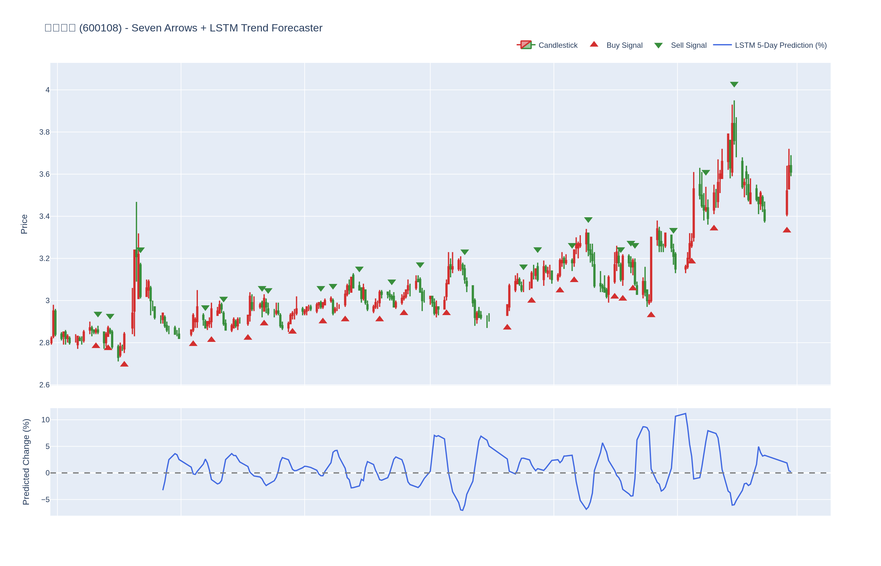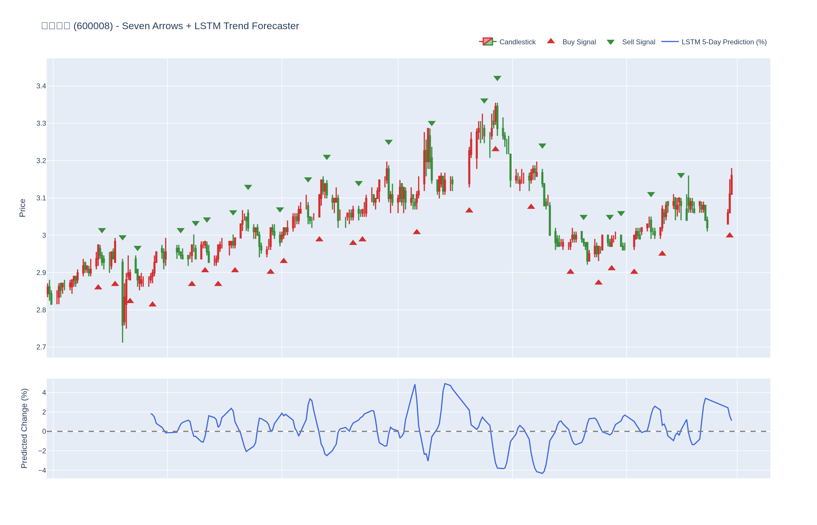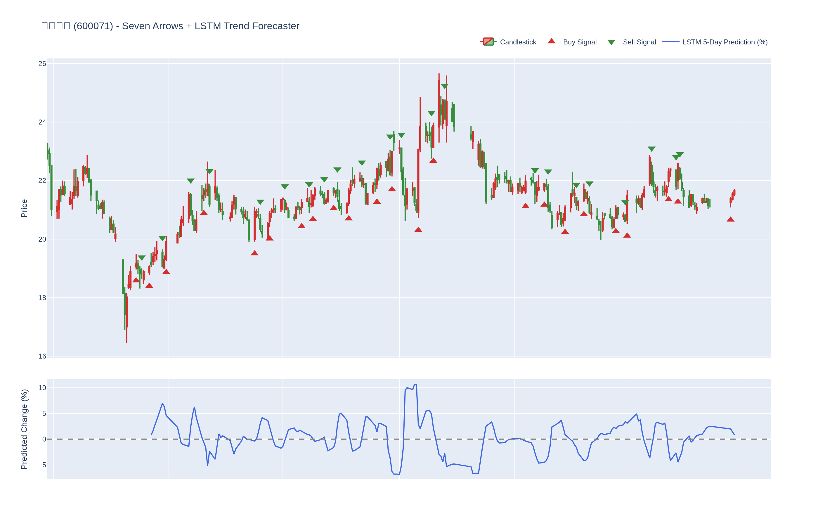 卖出 (Sell): ≤3 向上箭头 或 LSTM 预测未来价格 下跌 (≤0%)